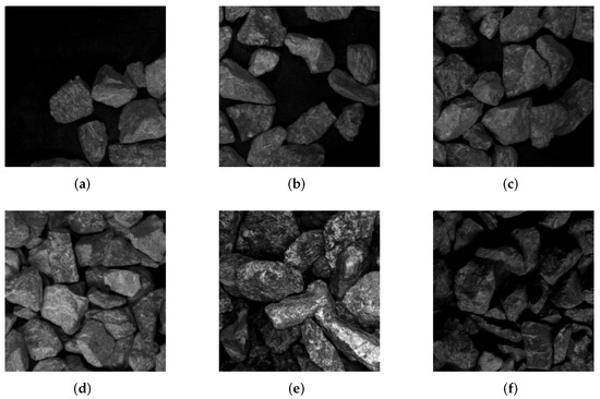 (a–d) depict ore images with varying densities under the same light. (e) is a different type of ore image with a smaller ore volume. (f) depicts the ore image in low light.