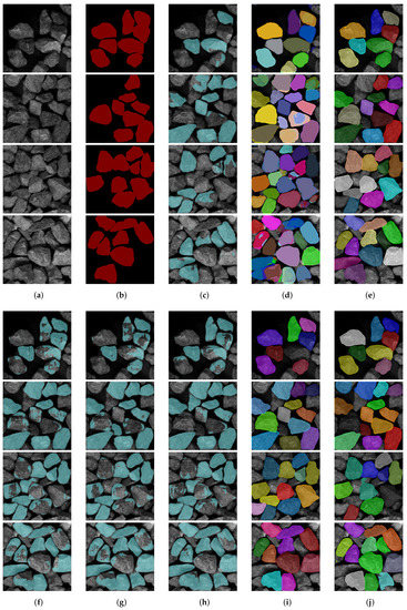 Recently, with the rapid development of computer hardware and new technologies, image-based, online, and real-time particle size measurement development has made much progress. For example, watershed [2,3,4] and FogBank [5] algorithms are often used in region-based segmentation techniques. However, it is difficult to accurately segment the ore particles with fuzzy edges, uneven illumination, and adhesion degree. Threshold-based methods are the most common parallel region technique, and certain requirements were followed to determine the grayscale threshold. For instance, Lu et al. [6] proposed a particle segmentation method to eliminate droplets in crystals and particle shadow by using the background difference and local threshold method, respectively. However, this method is not suitable for ore segmentation with overlapping. Zhang et al. [7] adopted the dual-window Otsu threshold method to determine the threshold value, which reduces the influence of noise and improves the thresholding performance of uneven lighting images efficiently. However, their method still cannot accurately segment ore images with overlapping and fuzzy boundaries. Malladi et al. [8] permuted a watershed transformation approach to generate superpixels efficiently, but this method is not robust enough and is time-consuming. Based on a multi-level strategy, Yang et al. [14] adopted the marker-based region growing method to carry out image segmentation. Mukherjee et al. [9] utilized a regression-based classifier to learn ore shape features, which improved the segmentation accuracy of ore particle boundary, but the parameters were manually adjusted. Zhang et al. [15] reduced noise and separated touching objects by combining wavelet transform and fuzzy c-means clustering for particle image segmentation. Ma et al. [1] devised a method for accurately segmenting belt ore images based on the deep learning method and image processing technologies. However, because this method requires the employment of several algorithms to analyze different types of ore pictures, the algorithm processing procedure is complex and slow. Wang et al. [10] proposed an improved encoder of U-Net based on Resnet18 to improve ore image segmentation accuracy.