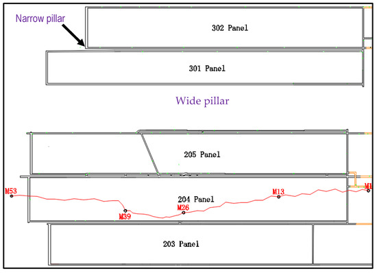 Layout of the longwalls simulated for this study. The layout shows the longwalls separated by narrow pillars in Area 2 (longwall 203–longwall 205) and Area 3 (longwall 301–longwall 302). The two areas are separated by a wide coal pillar. The layout also shows the subsidence survey line along the longwall 204.