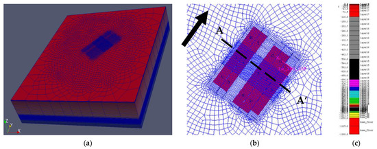(a) A 3D view of the model and a plan view of the COSFLOW finite-element mesh. The vertical direction has been exaggerated by a factor of 10. (b) The blue lines show the finite-element mesh, which is coarse at the model boundaries and very fine around and above the panels. The cross-section AA’ shows the subsidence measurement line on the model. A snapshot of gradually varying mesh along the vertical direction is shown in (c).