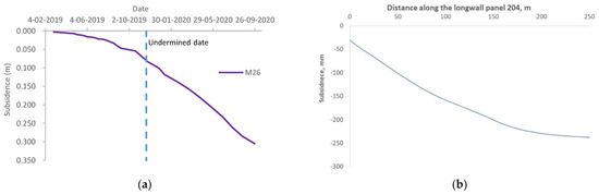 (a) Mine observed subsidence along the panel length during its excavation between May 2019 and September 2020; (b) modelled subsidence along the panel length.