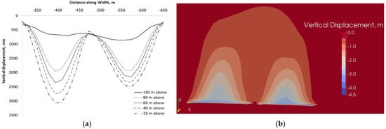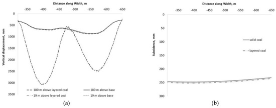 In the base case model discussed above, the coal was assumed to be solid (Table 2). For comparison, another model with layered coal is developed. The layered coal [30] is assumed to have a joint tension cut-off, joint cohesion, joint dilation angle, and joint friction angle of 0.05 MPa, 0.5 Mpa, 3°, and 25°, respectively. This comparison provides an effect of the nature of coal on strata deformation characteristics. The two models predict almost identical results in terms of overburden displacement characteristics and the ground surface subsidence (Figure 6). This observation suggests that under the modelled conditions, the nature of coal does not have an impact on the deformation behavior of the overburden strata.