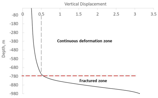 Figure 5 shows the vertical displacement at different depths along a vertical line in the center of the goaf. The vertical profile clearly shows two deformation zones above and below the depth of −780 m. According to the deformation characteristics, the zone below −780 m (200 m above the worked seam) can be characterized as the fractured zone, where large and continuous vertical strain occurs, and the zone above −780 m as the continuous deformation zone, where vertical strain is minor. The vertical strain of the estimated fracture zone is approximately 1.5%, which agrees with the vertical strain of greater than 0.98% defined in [29].