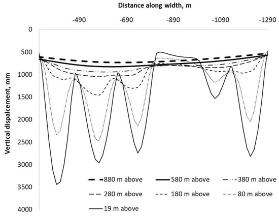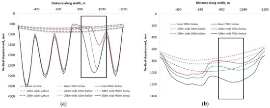 In Figure 8, the vertical strata movement caused by the excavation of longwall 301 is the second trough from the right-hand side (highlighted by the rectangular box). As the excavation width increases, the vertical displacement of the roof strata 19 m above the mining seam (represented by the 960 depth curves) increases. For the three cases, the maximum vertical displacement at this level is 1.1 m, 2.5 m, and 3 m, respectively (Figure 8b). As the vertical distance from the strata increases, the difference in the magnitude of vertical displacement lessens among the three cases. For instance, the difference in the vertical displacements at 960 m below the surface (19 m above the longwall) between the base case and the widest panel width is approximately 1.9 m (i.e., 3–1.1 m). The difference reduces to 0.4 m (i.e., 1.2–0.8 m) at 700 m below the ground surface (279 m above the mining seam), and 0.3 m (i.e., 1–0.7 m) at 300 m below the ground surface (679 m above the mining seam).