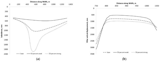 Figure 10 shows the results of the three cases with different overburden strengths. In these cases, the extraction height is set as 8 m. The stronger strata result in larger ground subsidence over longwall goaves (Figure 10a) and the pillars (Figure 10b) as well. This result could be related to the extent of the fractured zone. The standard empirical formula to estimate the height of fracture zone used in China [32,33] suggests that stronger overburden strata result in a larger vertical extent of the fractured zone. As a result, greater ground subsidence can be induced by the larger fractured zone. The relatively less dilation of strong strata above the fractured zone may also contribute to this phenomenon.