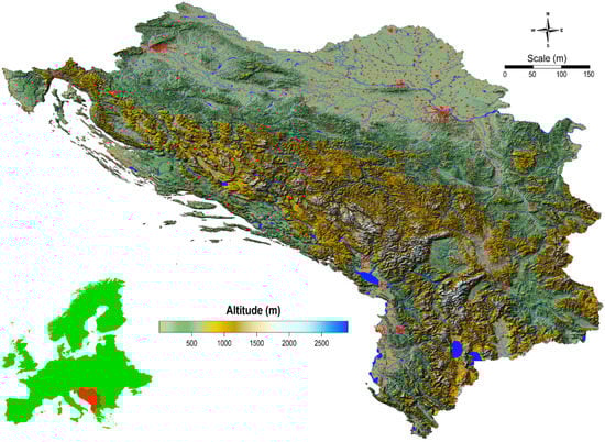 The West Balkan (WB) region consists of six countries: Serbia, Albania, Bosnia and Herzegovina, Croatia, Kosovo *, Montenegro, and North Macedonia. The terrain of the region is complex and spreads over hilly and mountain regions on the south and west, foreshore area on the east, and over a low altitude of the Pannonia Valley on the north, covering an area of 250,000 km2 (Figure 1) [29]. The weather in the peninsula is changeable and is greatly influenced on the one hand by the sea, and on the other by the mountains [29]. The northern and central parts of the Balkans are characterized by a central European climate, resulting in cold winters, warm summers, and well-distributed precipitation. The southern and coastal areas, however, have a Mediterranean climate with dry and hot summers and mild and rainy winters [30].