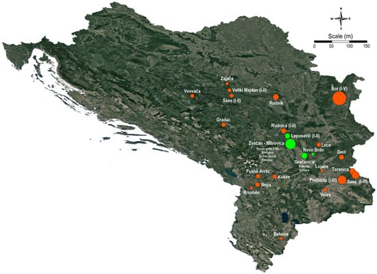 The countries of the West Balkan have the potential to extract raw materials from primary and secondary raw material deposits and can increase their self-sufficiency in raw materials by using appropriate, modern, and eco-efficient technology. The data presented in this study were partly obtained during the period of European projects funded by EIT Raw Materials, such as RESEERVE [39], RIS-CuRE [40], and RIS-RECOVER [41], where some authors also participated, partly from the authors’ archive documents, which are presented to the public for the first time as well as from the report [19] and the article [42].