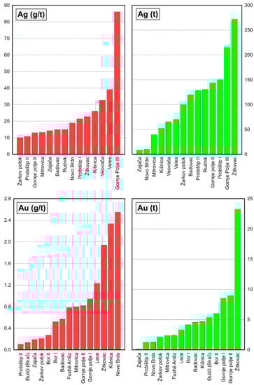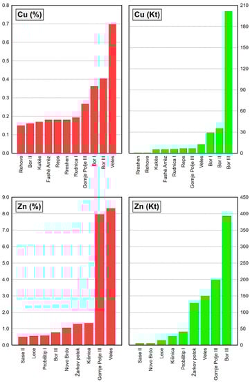 After a thorough review, it was concluded that the elements with the highest potential for further recovery using modern and efficient technology are the following: Ag, Au, Cu, and Zn (Figure 4 and Figure 5). As far as the metal content is concerned, Ag predominates in the tailings of Gornje Polje, but when the amount of metal is considered, it predominates in the tailings of Žitkovac, followed by Gornje Polje. As for silver, it is worth mentioning that the highest amount of gold is found in the Žitkovac tailings. However, the highest concentrations were measured in the Novo Brdo tailings. All the aforementioned deposits, i.e., Gornje Polje, Žitkovac, and Novo Brdo are located in Kosovo * and belong to either the Novo Brdo mining district or the Stari Trg mine. Both mining districts are rich in lead, zinc, and silver [18]. The content and quantity of copper and zinc appear similar. The concentrations of the two elements are highest in Veles (North Macedonia), while the amounts of these two elements predominate in the tailings of Bor (Serbia). On the other hand, the measurements in this tailings pile showed that the Zn content is less than 1%, which is much lower than the values determined in Veles, 8.5%. It should be mentioned that the Bor mine is a porphyritic deposit. This type of deposit in the Balkan region has a relatively low copper content but is profitable due to its size [39], while in Veles, metallurgical slags are stored, which generally have higher concentrations of metals than processing and mining waste.