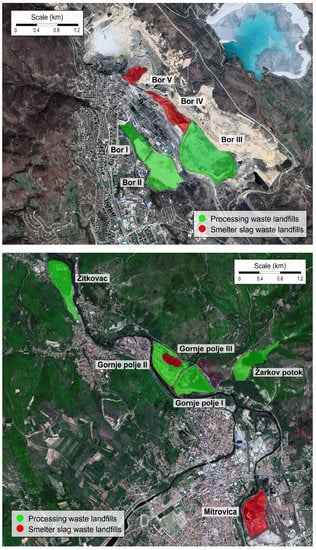 The main elements in the deposits studied are Al, Cr, Cu, Fe, Ni, Mn, Pb, Sb, and Zn, with a variety of trace elements, e.g., Ag, Au, Bi, and W. Copper mining generally generates most mining waste dumps. The largest amount of such waste is located in Serbia and covers more than 980 ha, followed by 520 ha generated from mining of Fe–Mn deposits in Bosnia and Herzegovina. As far as mining wastes are concerned, copper flotation residues make up the largest part of the landfills. In Serbia, these wastes cover an area of 1050 ha. Of the metallurgical slag landfills, the largest area (68 ha) is in Bosnia and Herzegovina and is part of the Fe–Mn smelting plant. The smallest amount of waste, on the other hand, usually comes from Sb mining and metallurgy.