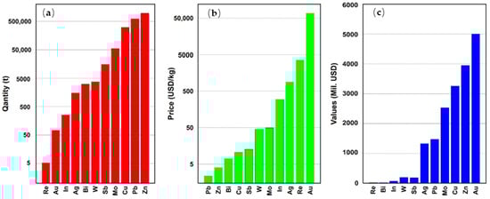 Examining the quantities of valuable elements stored in the West Balkan tailings, Zn is the most promising, followed by Pb, Cu, and Mo (Figure 7a). Indeed, the countries of the West Balkan are particularly rich in Pb–Zn ore deposits and Cu porphyry deposits. However, if we look at metal prices, gold has the highest value, which is often found in different types of ore deposits, depending on the mineralization process. Besides Au, the metals Re, Ag, and In are also highly traded in the market. In terms of elements to be recovered, gold is the most promising (Figure 7b,c). The total recovery is estimated at about 5010 million USD, followed by Zn, Cu, and Mo with about 3950, 3260, and 2540 million USD profit, respectively. In addition to Au, Zn, Cu, and Mo, both Pb and Ag are also promising prospects for mining. Mining of Pb and Ag can yield up to 1470 million and 1330 million USD in profit, respectively. Sb, W, In, Bi, and Re, on the other hand, have much lower potential for mining, despite their high market price, and are limited to certain locations in the West Balkan.
