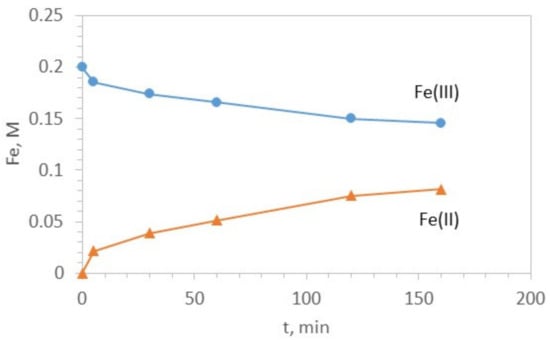 Kinetics of Fe(III) reduction with Fe(0). Initial solution: 0.2 M FeCl3 and 1.4 M HCl. Fe(0) dose 1.75 g/L.