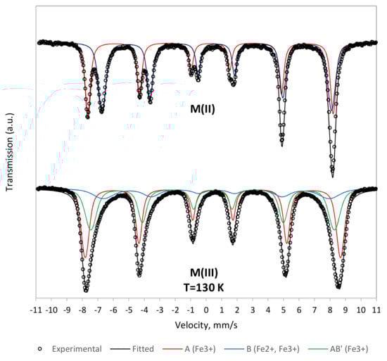 In the M(III) spectrum, the distinct fields of A and B components merged into a single sextet. The analysis was carried out at a lower temperature, i.e., 130 K, in order to improve peak resolution, but the main characteristics of the spectrum did not change.