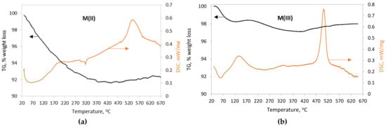 The TG and DSC curves of the magnetite nanoparticles are presented in Figure 5a,b. The TG curve of M(II) nanoparticles (Figure 5a) indicates a weight loss in the order of 8%, which takes place between 25 and 300 °C. This can be attributed to the loss of physically and chemically bound water, as well as the desorption of loosely bound anions, such as SO4 and NO3, originating from the precursor synthesis solutions. Thermal analysis of iron nitrate and sulfate compounds indicates that under an inert atmosphere, the removal of nitrates takes place in the temperature range between 100 and 140 °C [38], while that of sulfates is extended to higher temperatures up to 700 °C [39,40]. The DSC curve exhibits a wide endothermic peak between 25 and 170 °C and a small one at 310–330 °C. A clear exothermic peak was recorded at 535 °C and can be attributed to the formation of hematite (α-Fe2O3) by the following equation:
