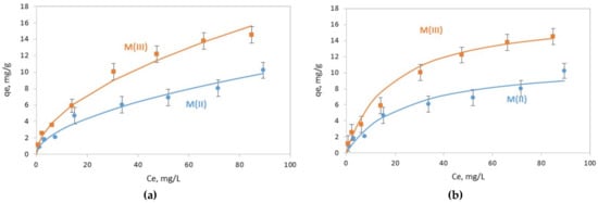 The two types of magnetic nanoparticles were tested for their ability to adsorb Cr(VI). The adsorbed amounts of Cr(VI) on the solid phase (qe, mg/g) as a function of the residual concentration in the aqueous phase (Ce, mg/L) are presented in Figure 6.
