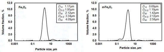 Volumetric particle size distribution of magnetite and hematite powder. D [3;2] is the Sauter mean diameter and D [4;3] is the volume mean diameter. D10, D50, and D90 values correspond to the size of particles that are 10, 50, or 90% smaller than all the particles in the sample, respectively.