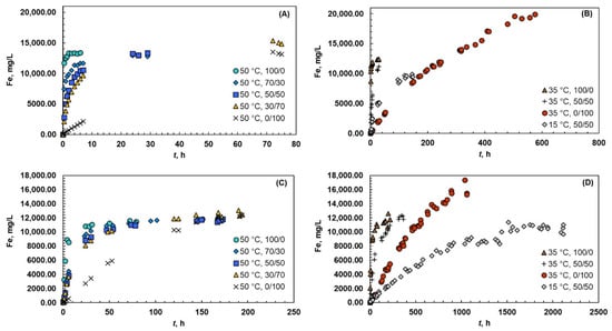 Solubility of iron at 15, 35, and 50 °C and different acid systems (Ox/HNO3). The experiments were carried out with magnetite (A,B) and hematite (C,D).