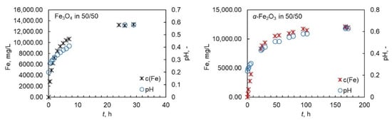 The data from the thermodynamic experiments is shown in Figure 2A,B for magnetite and in Figure 2C,D for hematite. The solubility of magnetite varied from 10,000 mg/L to 20,000 mg/L, whereas the solubility of hematite exhibited slightly lower values from 10,000 mg/L to 16,000 mg/L.