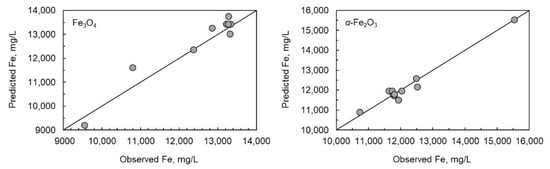 As the multiple linear regression models failed, the special cubic model was generated (Equation (21)). The R2-values were good (0.9988 for magnetite and 0.9997 for hematite). The results for special cubic model Equation (25) for magnetite and Equation (26) for hematite are presented in Figure 4, which illustrates the scatter plots for both solids.