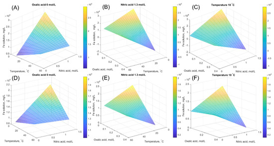 Surface plots of equilibrium iron concentration calculated by the developed model at fixed oxalic acid concentration, at fixed nitric acid concentration, and at fixed temperature. (A–C) are for magnetite and (D–F) are for hematite.