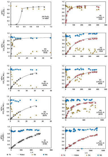 The fraction of iron dissolved from magnetite and hematite during the kinetic experiments are shown in Figure 6. The shape of the dissolution curve varied depending on the acid system. In pure oxalic acid, a clear sigmoidal trend indicating an induction step can be seen in the case of magnetite and hematite (Figure 6A,B). This induction step was shorter when the amount of nitric acid increased (Figure 6C–J). In pure nitric acid systems (Figure 6I,J), the dissolution showed almost a linear trend, i.e., the rate of reaction was stable during the whole process and no accelerating effect of nitrate ions (NO3−) could be seen. The linear shape indicates that the dissolution proceeded via protonation, which confirms the initial hypothesis made on the reaction mechanism.