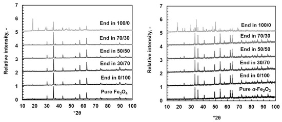 XRD patterns for original powder and dissolved in different (Ox/HNO3) systems at 35 °C. Original powder: magnetite on the left and hematite on the right.