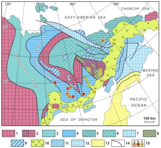 - Sokolov, S.D. Essay on the tectonics of the northeast of Asia. Geotectonics 2010, 6, 60–78. [Google Scholar]