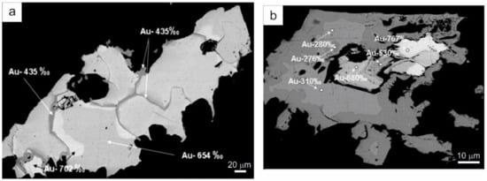 - Nikolaeva, L.A.; Gavrilov, A.M.; Nekrasova, A.N.; Yablokova, S.V.; Pozdnyakova, N.N.; Shatilova, L.V. Typomorphism of native gold. In Guidelines for Exploration Work; Krivtsov, A.I., Vartanyan, S.S., Eds.; TsNIGRI: Moscow, Russia, 2021. (In Russian) [Google Scholar]