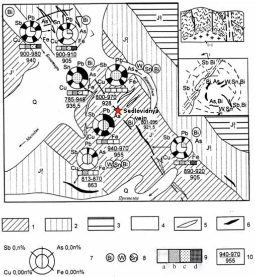 - Savva, N.E. Silver Mineralogy of the North-East of Russia. In Proceedings of the SVKNII FEB RAS; Sidorov, A.A., Ed.; Triumph: Moscow, Russia, 2018; 544p. (In Russian) [Google Scholar]