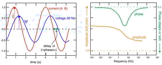 The procedure that is used to measure induced polarization in the laboratory or in the field is similar to one of the classical electrical methods [2]. An electrical current is injected into the ground or through a core sample through a bipole of (current) electrodes (A and B). We observe the associated voltage or electrical potential difference at a pair of receiving (voltage) electrodes (M and N). Figure 1 and Figure 2 illustrate the concept of time-domain induced polarization and chargeability. The existence of various definitions of the chargeability makes the literature, at first, a bit cryptic to read for newbies in the field. Usually, the measurements are performed in the time domain in the field, or in the frequency domain in the laboratory (Figure 3, see [51]). With that being said, it is worth noticing that more and more field investigations are based on frequency-domain induced polarization measurements [28,52,53,54,55]. In our viewpoint, it does not really matter if the measurements are performed in the time domain or the frequency domain. The date can even be acquired in the time domain and can be inverted in the frequency domain, or vice versa.