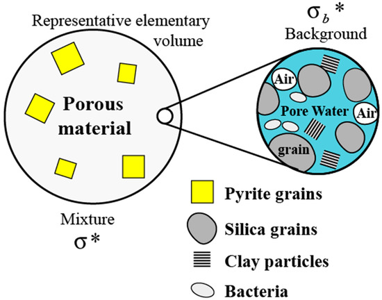 Sketch of the complex background and the mixture between the background and the metallic particles (with metallic grains, for instance, pyrite). The background material can be partially saturated (with air as a nonwetting immiscible fluid) at a partial saturation. It can comprise various types of grains. Polarizable bacteria can be present in the pore space. The quantities σ* and denote the complex conductivity of the mixture and the complex conductivity of the background material around the metallic particles, respectively.
