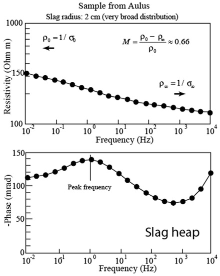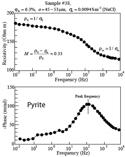 If the grain-size distribution of the metallic particles is close to a log-normal distribution, the Cole–Cole model is known to provide an accurate representation of the induced polarization spectra of the disseminated ores [35]. Figure 6 and Figure 7 are examples of spectra that could be fitted with a Cole–Cole model [35]. We therefore write the complex conductivity of the mixture by using a Cole–Cole model as [46]: