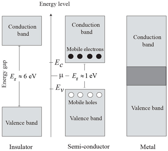 Conduction band, valence band, and the energy gap in an insulator, a semiconductor, and a metal. The distinction between insulators and semiconductors resides in the value of the energy-band gap (Eg). The energy band denotes the region of discrete energy levels with very close spacings. Electrons and positive holes in the energy gap can be considered as low-density particle ensembles, such as in an ideal electrolyte. These energy levels can be treated as ions in an electrolyte, or as particles in a box (Fermi gas model). In an intrinsic semiconductor (no impurities), the concentrations of the charge carriers depend on the energy gap from the chemical potential (μ), which itself corresponds to the Fermi level (in the middle between the conduction (EC) and valence (Ev) energy bands). Modified from [64].
