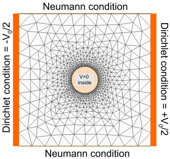 Finite element mesh for the 2D numerical simulations together with the boundary conditions used in the numerical model. The potential is constant inside the metallic particle and is imposed at the external boundaries that correspond to the current electrodes. The potential is computed around the metallic grain in the background material. Modified from [45].