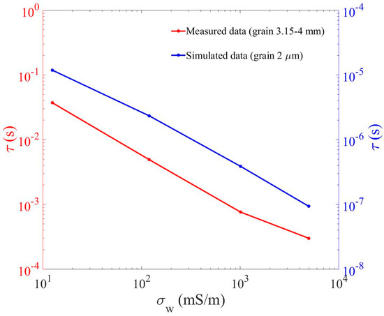 Dependence of the relaxation time on the conductivity of the background where denotes the conductivity of the KCl electrolyte that is used as the background in the numerical simulations. The vertical shift between the τ measured and the τ simulated corresponds to the distinct grain sizes in the physical and numerical experiments. These experiments show that the relaxation time is inversely proportional to the conductivity of the background.