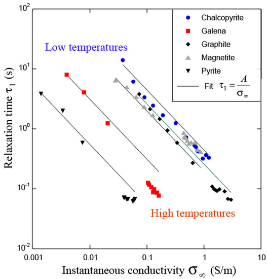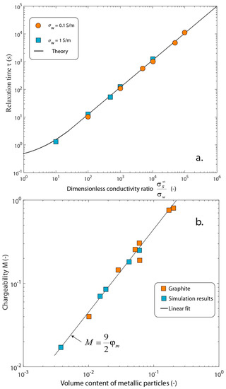 For small grains (<100 μm), the induced-polarization response is dominated by field-induced diffuse layers outside of the metallic grains, and the model that was developed by Bücker et al. (2018a,b) [39,40] can be used to understand the process, as discussed above. For large grains (>500 μm at low salinity), we can neglect the formation of field-induced diffuse layers outside of the grains. For a grain with a radius of 1.5 cm, the relaxation time is in the order of a few seconds. The numerical simulations show that the relaxation time decreases with the increase in the conductivity of the background electrolyte, and that it increases with the increase in the metallic particle conductivity itself (Figure 12). This dependence is written as: