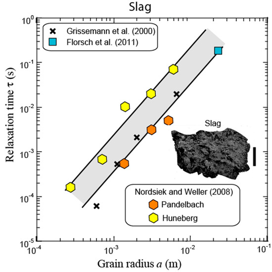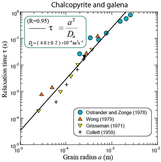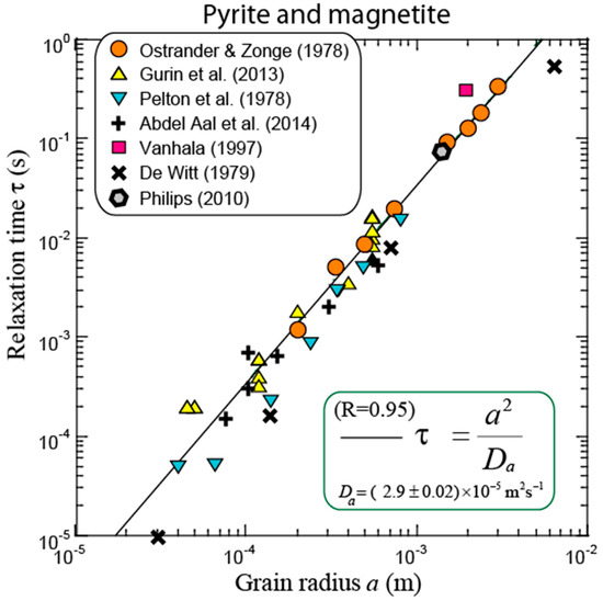 Our goal now is to determine an expression of the relaxation time (). From the dimensional analysis, the main relaxation time (for the complex conductivity, Equation (5)) is written as: [70], where is the (apparent) diffusion coefficient of the charge carriers that are responsible for the polarization of the conductive particles. In Equation (5), and denote, respectively, the DC conductivity () and the high-frequency conductivity of the porous material (). Olhoeft (1985) [6] determined that the relationship between the relaxation time of the pyrite-bearing porous media and the radius (a) of the metallic particles is , and that, therefore, using leads to = 3.0 × 10−5 m2 s−1.
