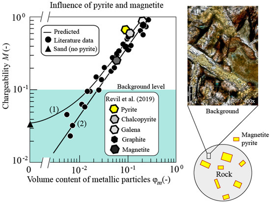 Total chargeability versus pyrite content. Comparison between the prediction of the linear relationship (plain line) and the experimental data from Gurin et al. (2013) [70] (filled symbols except the triangle), Pelton et al. (1978) [11] (crosses), and Mahan et al. (1986) [65] (triangles). In the first case, the ore is a mixture of (by volume) pyrrhotite (30%), pyrite (30%), magnetite (30%), and chalcopyrite (10%). The sample with the pyrite grains that are from 1 to 2 mm in radius is from Phillips (2010) (pyrite, sample K01, sericite quartz, 10% vol. pyrite) [82]. In the second case, the metallic grains correspond to pyrite. The chargeability is expressed as a function of the volume content of the metallic particles (). This relationship is independent of the grain radius (a) of the metallic particles, as predicted by the model. For this dataset, the background porous material is characterized by a low chargeability, and so we are in the case that is described in Section 3. Modified from [64].