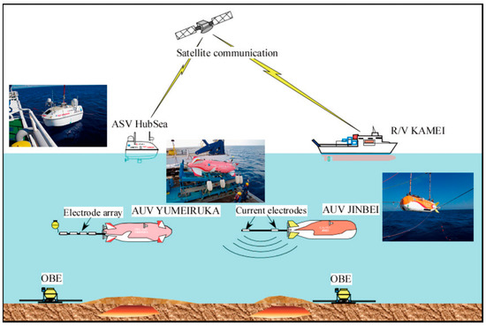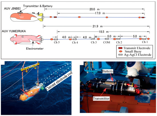 - Kasaya, T.; Iwamoto, H.; Kawada, Y.; Hyakudome, T. Marine DC resistivity and self-potential survey in the hydrothermal deposit areas using multiple AUVs and ASV. Terr. Atmos. Ocean. Sci. 2020, 31, 579–588. [Google Scholar] [CrossRef]