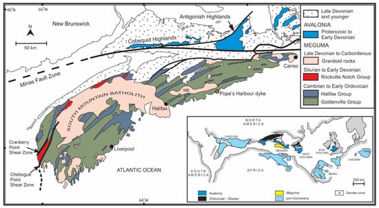 Simplified bedrock geological map of southern Nova Scotia showing the distribution of Late Devonian and older rock units of Avalonia and Meguma and the location of the Popes Harbour dyke. MB—Musquodoboit Batholith. Inset shows the Early Mesozoic reconstruction of Pangea and the locations of Meguma, Avalonia, and other peri-Gondwana terranes [33].