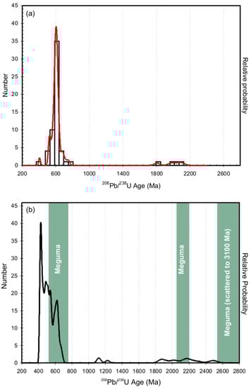 - Krogh, T.E.; Keppie, J.D. Age of detrital zircon and titanite in the Meguma Group, southern Nova Scotia, Canada; clues to the origin of the Meguma Terrane. Tectonophysics 1990, 177, 307–323. [Google Scholar] [CrossRef]