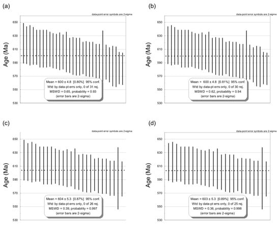 A comparison of zircon 206Pb/238U ages-weighted mean ages that include or exclude the youngest and oldest zircons of the main population. (a) All zircons from ~581 to ~619 Ma. (b) All zircons from ~581 Ma to ~616 Ma. (c) All zircons from ~591 Ma to ~619 Ma. (d) All zircons from ~591 Ma to ~616 Ma. Data uncertainty is reported at 2-sigma values. MSWD—mean standard of weighted deviates.