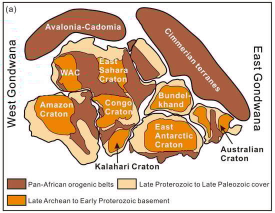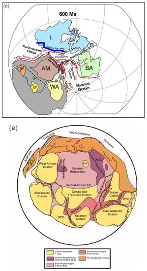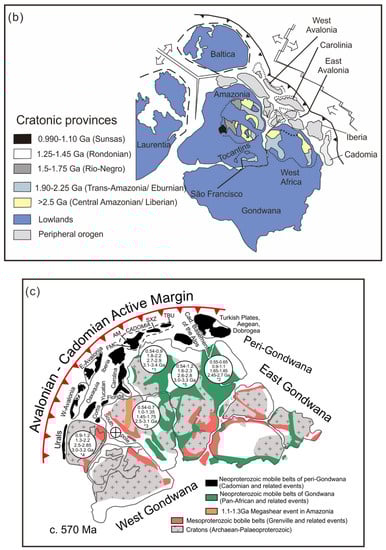 - Nance, R.D.; Murphy, J.B.; Strachan, R.A.; Keppie, J.D.; Gutiérrez-Alonso, G.; Fernández-Suárez, J.; Quesada, C.; Linnemann, U.; D’Lemos, R.S.; Pisarevsky, S.A. Neoproterozoic-early Paleozoic tectonostratigraphy and palaeogeography of the peri-Gondwanan terranes: Amazonian v. West African connections. In The Boundaries of the West African Craton; Ennih, N., Liégeois, J.-P., Eds.; Geological Society of London Special Publications: London, UK, 2008; Volume 297, pp. 345–383. [Google Scholar]