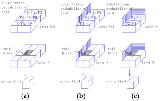 Figure 2. Transfer model of void blocks. (a) Nine-block model; (b) Six-block model; (c) Four-block model.