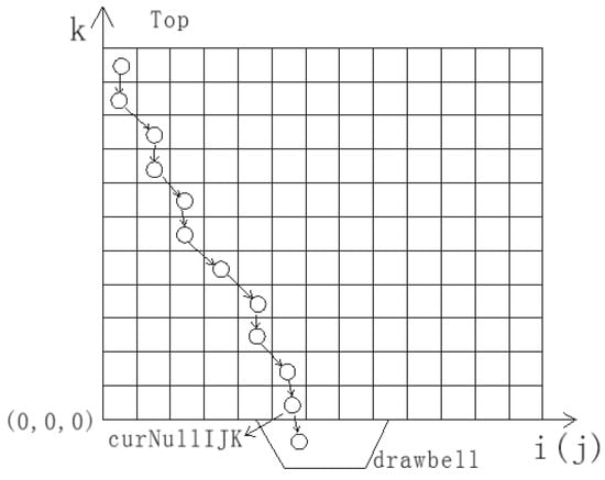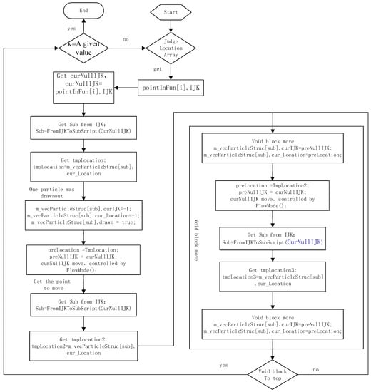 Particle flow simulation relies on the following variables and functions: nDrawOut, integer variable, represents the number of drawn out particles. κ, the draw-out index, a floating point number variable, is the ratio of the number of drawn out particles to the total number of particles, and k ( 0 , 1 ) . curNullIJK and preNullIJK are arrays used to locate void blocks. TmpLocation, TmpLocation2, and preLocation are DmDPoint type variables used to indicate temporary locations of void blocks. The function pointInFun() is used to determine the particles in the funnel area during the flow process, and the location array of particles satisfying the conditions is stored in the pointInFun array. For the pointInFun array with capacity n, the location array of the i-th particle is pointInFun[i]. The function IJK, 0 < i < n; FlowMode() is used to determine the flow model based on Attribute Stochastic Medium Theory. Finally, the function FromIJKtoVecScript() is used to obtain subscripts from location arrays.