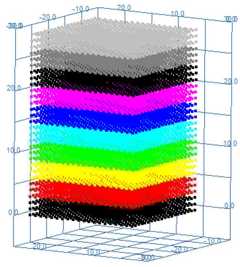 The size of selected mineral-rock heap is 20 × 20 × 30 m3, the size of the discrete attribute block model is the unit size, the recording attribute is the grade of Cu, and the size of the drawbell outlet is 3.5 × 3.5 × 3.2 m3. After building the block model, the block grade is obtained by attribute difference technology and stored in the particle structure corresponding to the center-point of the attribute block. The discrete particle model of the selected mineral-rock heap is shown in Figure 6.