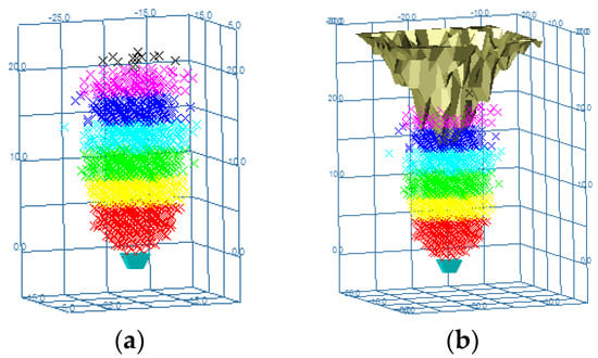 The discrete particle point has the flow particle attribute structure defined in Section 2.3.1, which is stored in the particle structure array m_vecParticle Struc. The outlet location array is determined by the Monte Carlo method to start the flow simulation of the attribute particle. The simulation process is shown in Figure 4. The isolated extraction zone (IEZ), that is, the drawn body, remnants, and contact surface, were obtained by simulation, and its shape and properties were analyzed. The IEZ refers to a virtual three-dimensional body formed in the original space before granular flow, after which the grains were finally drawn out from the drawbell [9]. Remnants refer to a real three-dimensional body formed in the caving heap space after granular flow. The contact surface is the interface between the ore blocks and rock blocks.