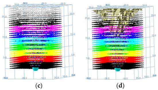 Figure 7. Results of ore draw simulation (κ = 10%). (a) Drawn body; (b) Compound diagram of drawn body and ore-rock interface; (c) Remnants; (d) Compound diagram of remnants and ore-rock interface.