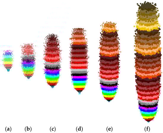 Based on the algorithm proposed in Section 2, we implemented this simulation method of the attribute particles flow and tested it. The test was divided into five groups, corresponding to draw-out index κ values of 3%, 5%, 10%, 15% and the cutoff value of κ. The selected κ is not very large because some particles cannot be drawn out due to caving heap ridge remnants, so there is a maximum κ value (cutoff κ). In addition, for the flow simulation of the fixed target mineral-rock heap, a too large draw-out index κ will also lead to obvious drawing truncated ellipsoid, which is not conducive to describing the shape of the IEZ. The simulation results are shown in Figure 7 and Figure 8 and Table 1.