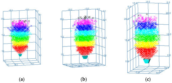Figure 10. Results of ore draw simulation (κ = 10%). (a) Block index β = 1; (b) Block index β = 2; (c) Block index β = 3.