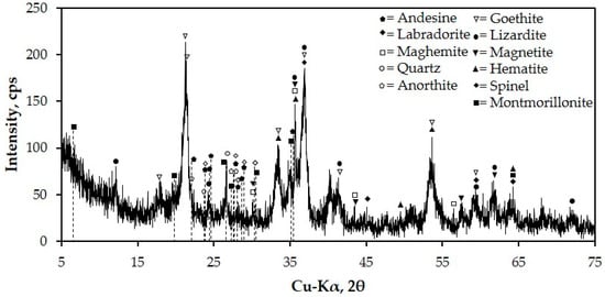 Mineralogical analysis using XRD of the NMW shown in Figure 2 reveals that the minerals present are goethite, lizardite, spinel, quartz, magnetite, maghemite, hematite, montmorillonite, andesine, labradorite and anorthite where some of these minerals were also identified in the study of Longos et al. who used the same NMW source [26]. The summary of the minerals with their corresponding formula is presented in Table 2. The results of the XRF analysis of the iron content are consistent with the presence of the iron-bearing minerals such as goethite, magnetite, maghemite and hematite. Phyllosilicate minerals such as montmorillonite, lizardite and other silicates can be potentially useful for slip casting production of ceramic tiles. However, this could also pose some challenges since the usual ceramic tile production generally uses kaolin and bentonite types of clays.